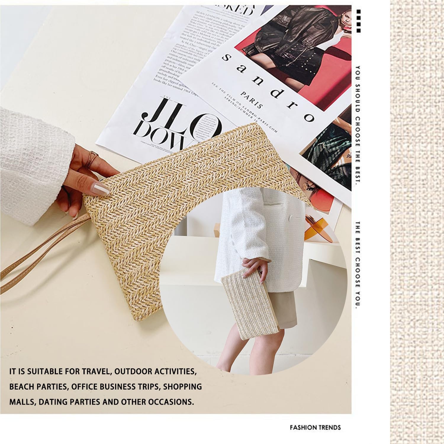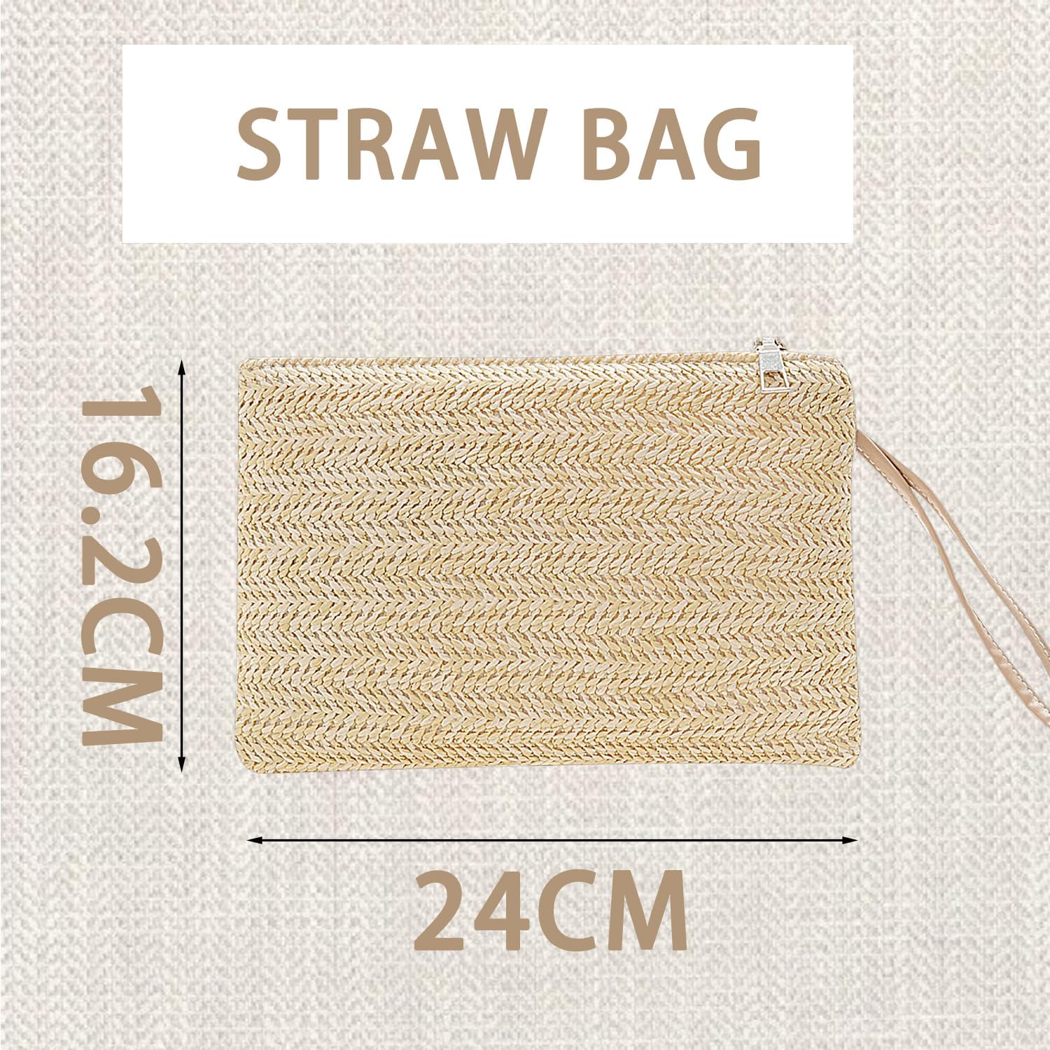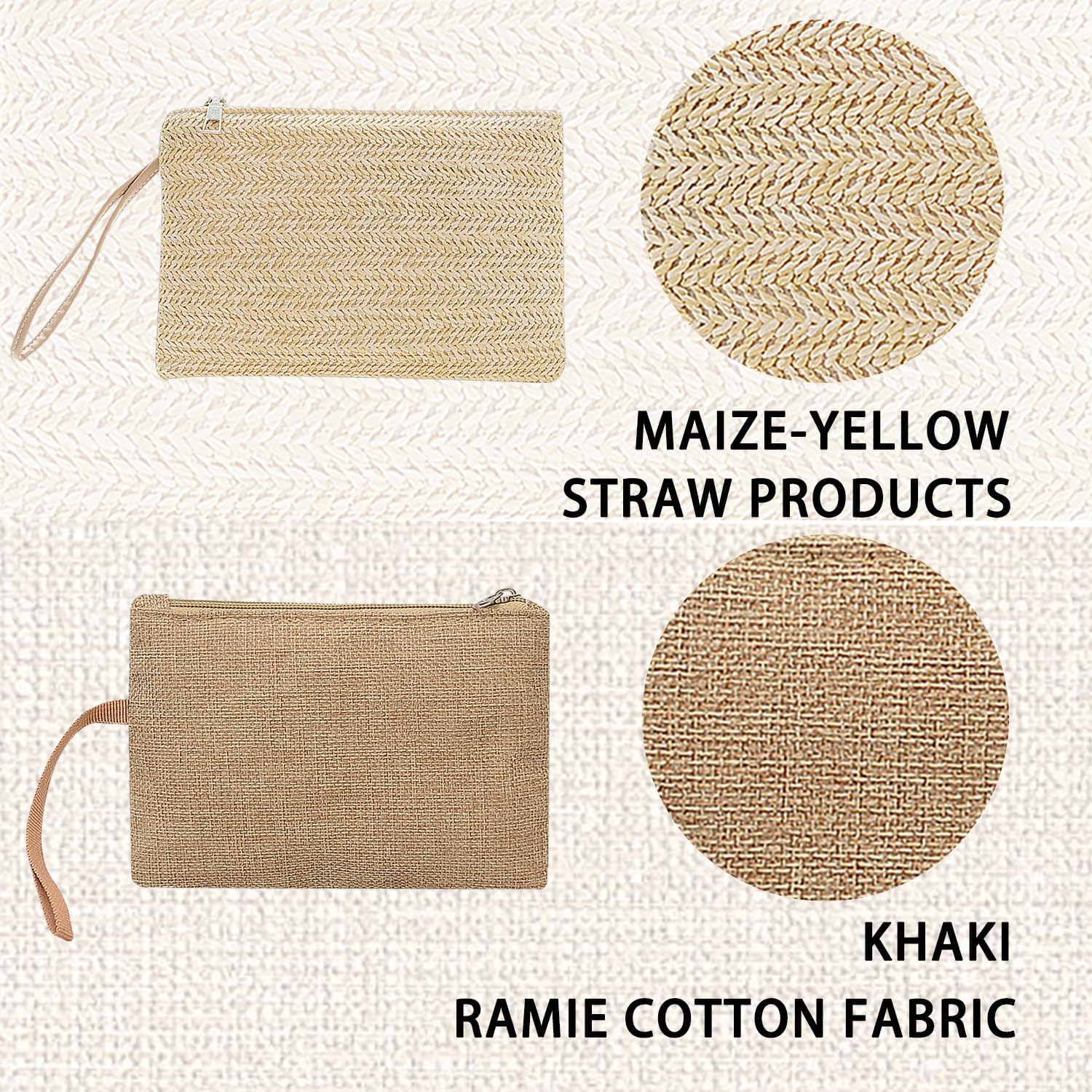 1 x Beige Fabric Bag, 1 x Khaki Carry Bag, Women Straw Boho Clutch Bag, Summer Beach Bag