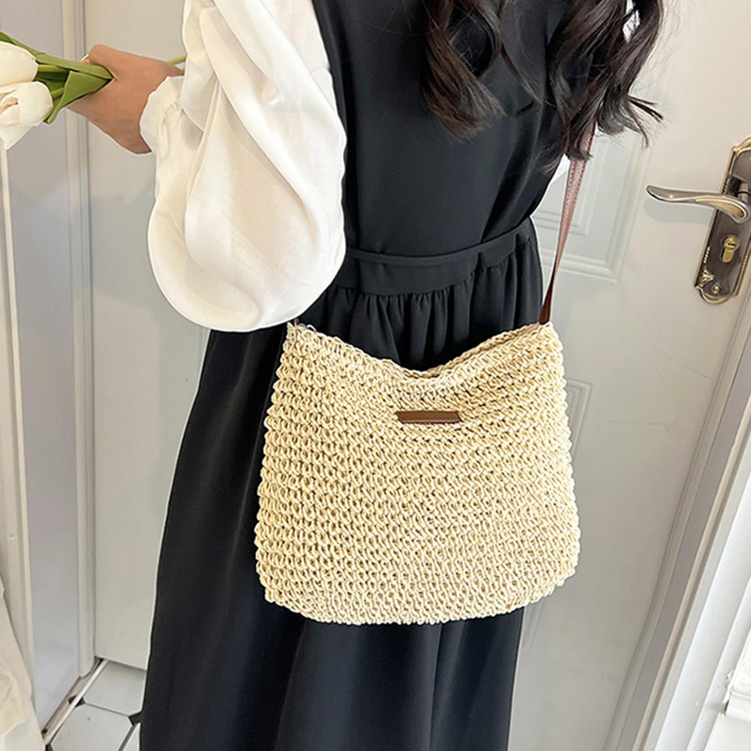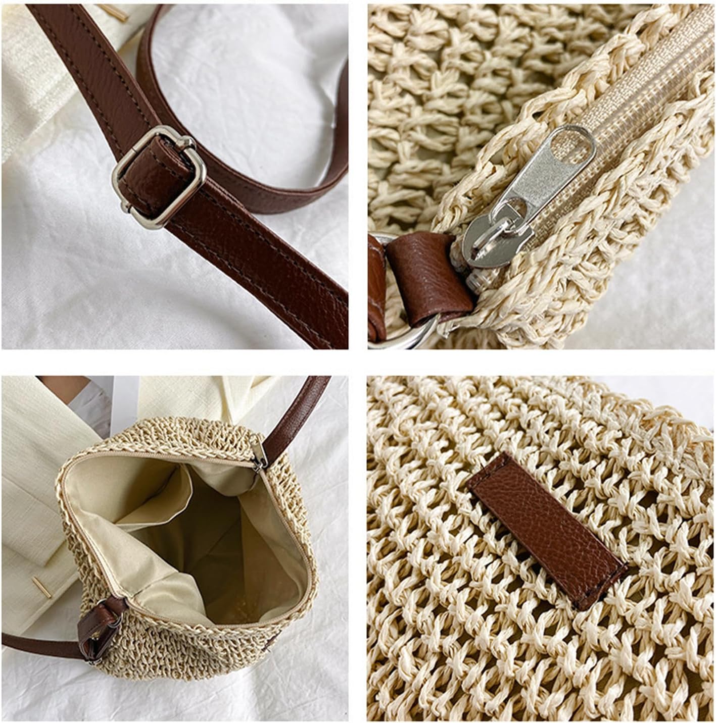 1 x Women Straw Shoulder Bag Summer Beach Bag Fashion Shoulder Bag with Zipper and