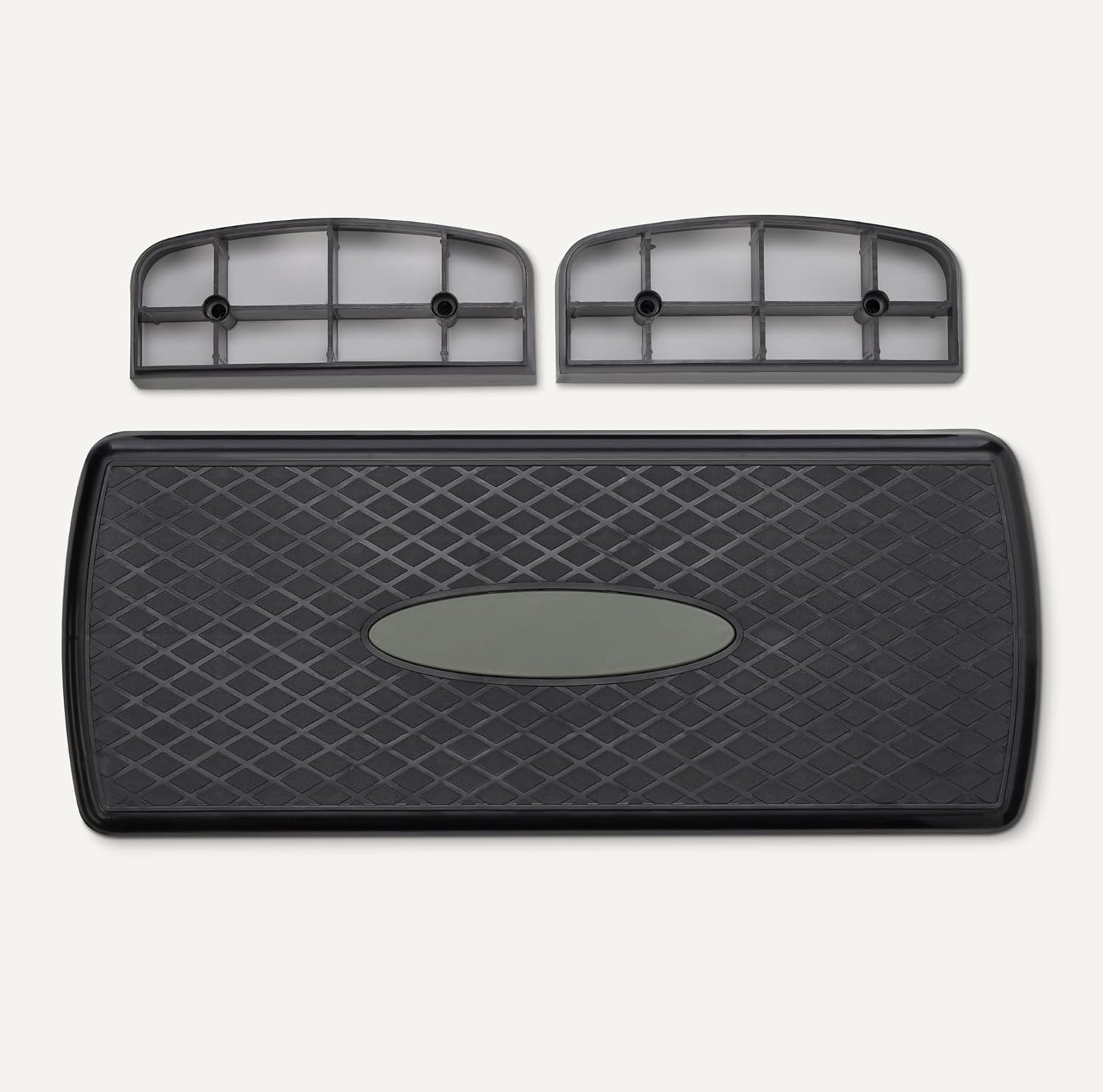 Compact size 68.0 x 28.0, perfect for home workouts, with convenient raised shelf under the platform