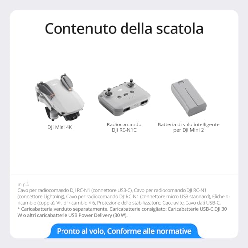 Include DJI Mini 4K, 1 batteria, un RC-N1C e tutto il necessario per facili voli in 4K. Una scelta eccellente e conveniente per i principianti.