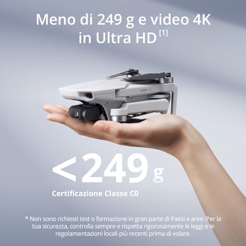 Peso inferiore a 249 g, Certificazione Classe C0 – Essendo ultraleggero, Mini 4K è autorizzato a volare nelle categorie A1 e A3. Gli operatori non devono sostenere alcun test.