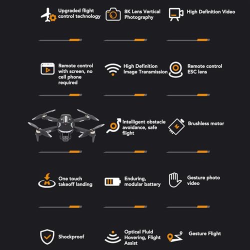 Evitamento di ostacoli intelligenti: incorpora rilevamento di ostacoli intelligente per evitare collisioni e presenta robusti motori senza spazzole per voli più tranquilli ed efficienti.