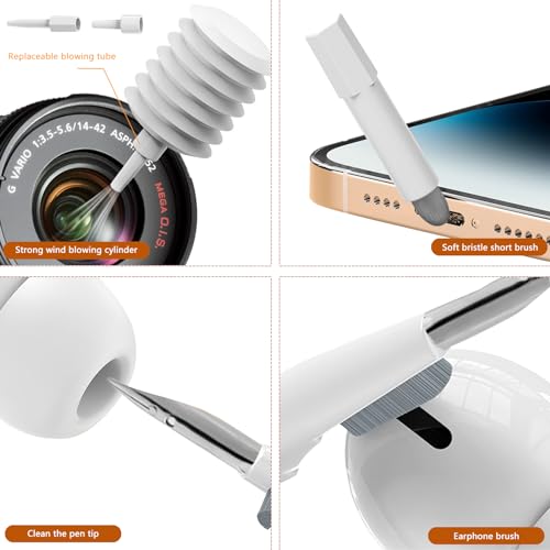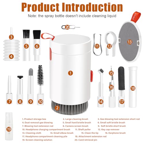 20 IN 1 E PORTATILE — Il kit di pulizia multifunzione 20 in 1 può soddisfare le vostre diverse esigenze: cuffie per la pulizia, tastiere, schermi elettronici dei prodotti, obiettivi della fotocamera e altro ancora. Il design perfetto consente una facile conservazione in borse o cassetti della scrivania, risparmiando spazio.