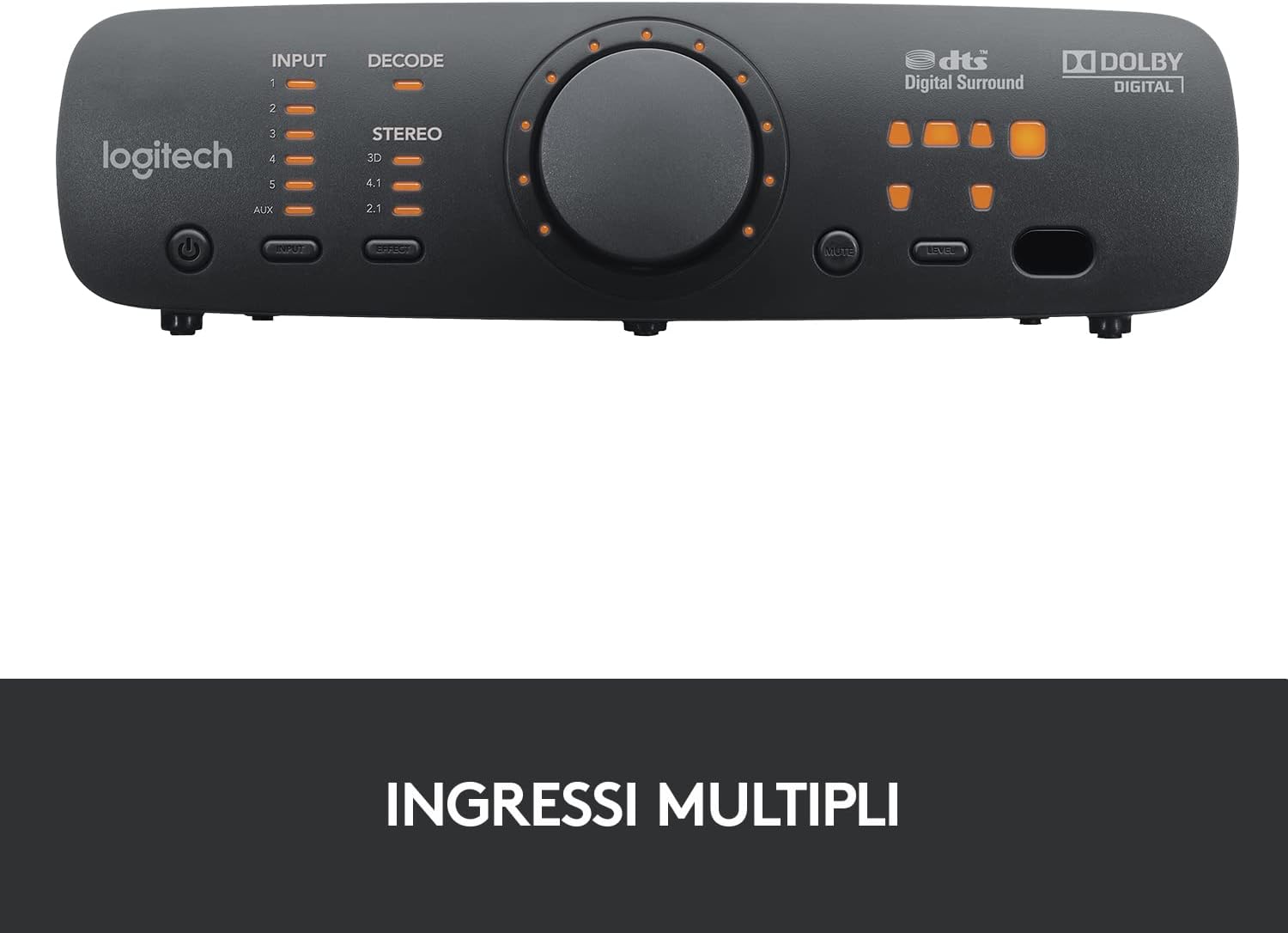 THX, Dolby and DTS Certified, 1000 Watt Power, Multi-Device, with Remote Control, EU/IT Socket, PC/PS4/Xbox/TV/Smartphone/Tablet Experience the full surround sound capable of crossing you, discover the Logitech Z906 5.1 3D speakers. If you are looking for a speaker on the market, among the results you will find the Surround Sound 5.1 system, which impresses with its numerous functions, applications and excellent sound quality. Logitech Z906 5.1 stands out for its excellent audio playback thanks to its 1000 watt or 500 watt RMS power. Coaxial speakers emit lossless sound and create a set of piercing bass and clear treble. The Logitech Z906 5.1 1000w speaker has multiple inputs, so you can connect up to six devices to your audio system simultaneously. These 5.1 speakers support devices with a headphone jack (3.5mm), cinch connector, 6 channel direct connector, digital coaxial connector and digital optical connector. Whether it’s a TV, Blu-ray or DVD player, DVD recorder, console, iPod or stereo, THX certified Logitech Z906 5.1 speakers are compatible with any audio and home theater device. The included infrared remote control allows you to control the system comfortably from the sofa and change the output device to your liking. 5.1 speakers also allow decoding of Dolby Digital and DTS-encoded audio tracks, delivering a complete and great audio experience when playing movies and music.