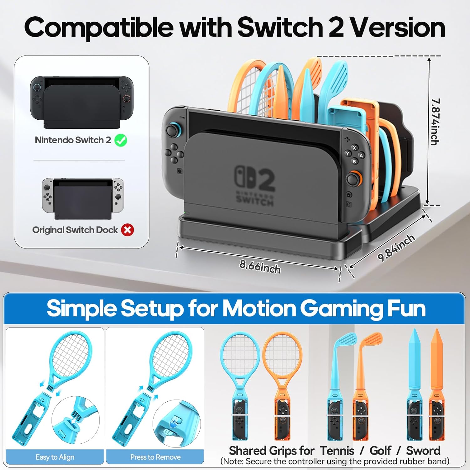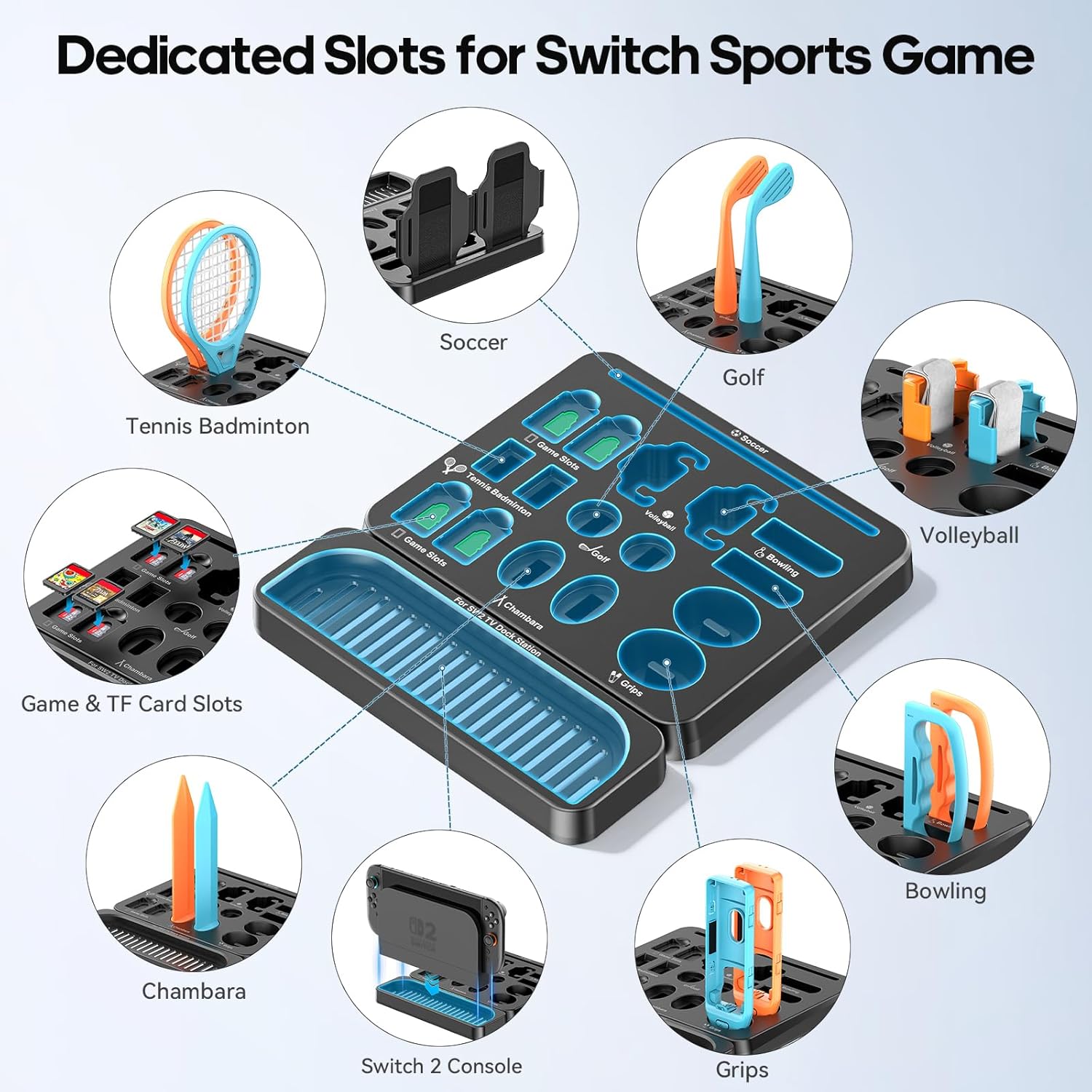 Design for Switch Version 2: This Switch 2 organizational station to store all Switch sports game accessory kit, includes 1 Switch 2 console, 4 game/TF Switch cards, 2 Joy-con shared grips, 2 golf clubs, 2 tennis/baminton rackets, 2 wrist straps, 2 leg straps, 2 swords, 2 bowling grips, Keep tidy your play area with the Tokluck Switch 2 Nintendo Switch Interactive Gaming Figures Sports Accessory Bundle