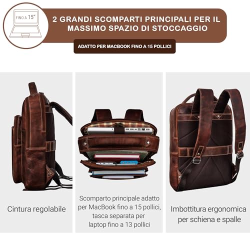 TUTTO IN UN SENSO: Dimensioni (LxWxH): 30 x 12 x 40 cm | Peso: 1000 grammi | Materiale: Vera pelle di mucca | Un sacco di spazio di archiviazione: Due grandi scomparti, scomparto imbottito (29 x 30cm) per 13 \’pollici Macbook, 15\’ pollici Macbook nel vano principale non imbottito | 1 x piccolo scomparto con zip ogni interno ed esterno, due piccoli scomparti interni