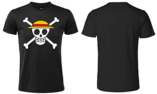 T-Shirt One Piece Cappello di Paglia Logo Teschio Ufficiale. Maniche Corte. 100% Cotone. Unisex. Taglie da Adulto Ragazzo. (Nero, L)