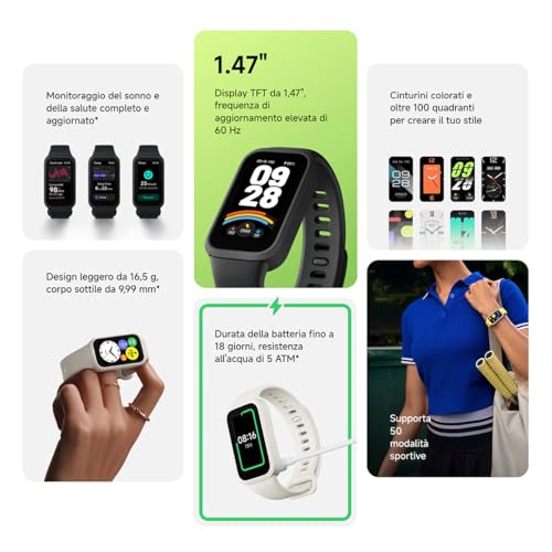 XIAOMI Smart Band 9 Active, Schermo TFT 1.47″, Monitoraggio Salute: SpO2, Frequenza